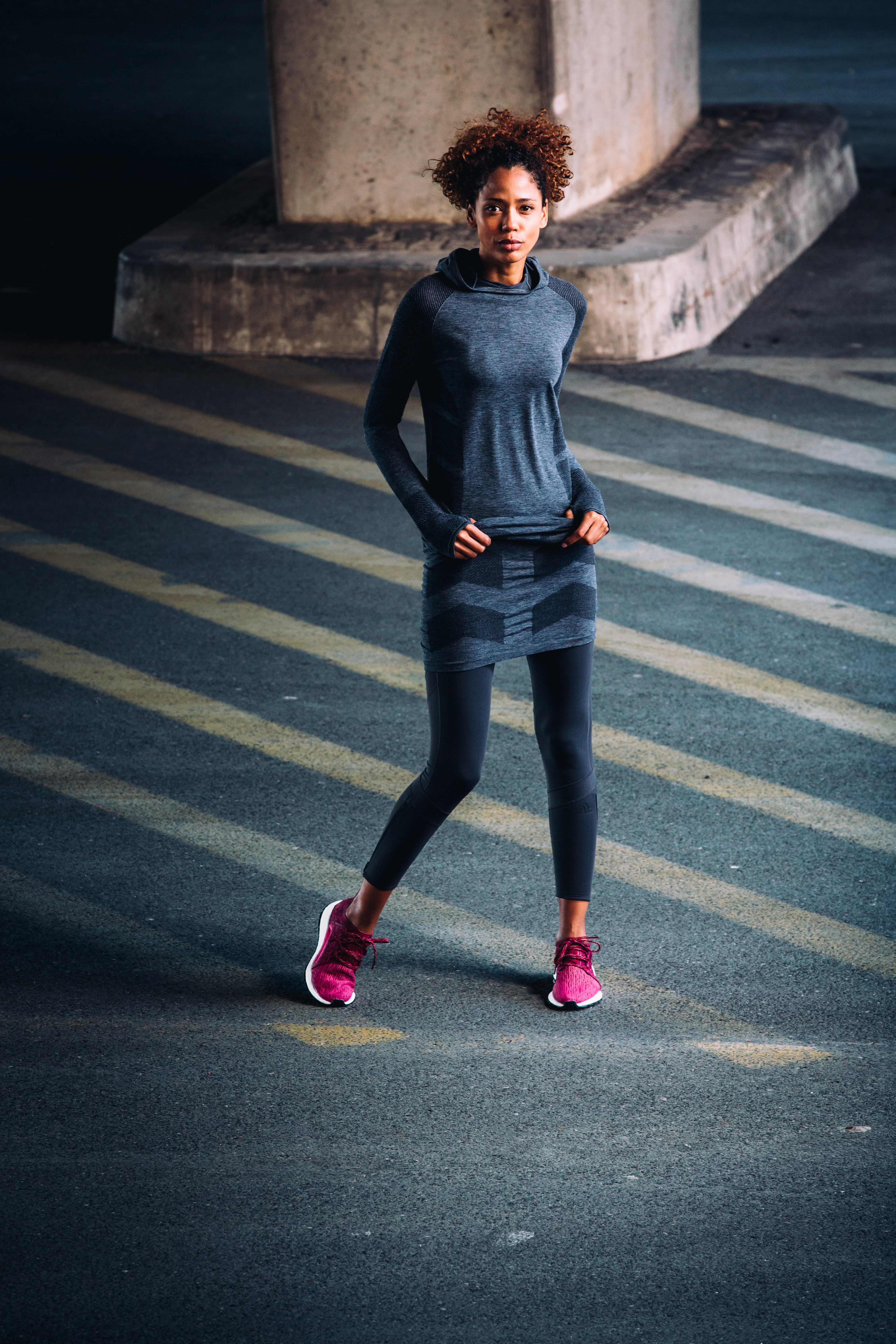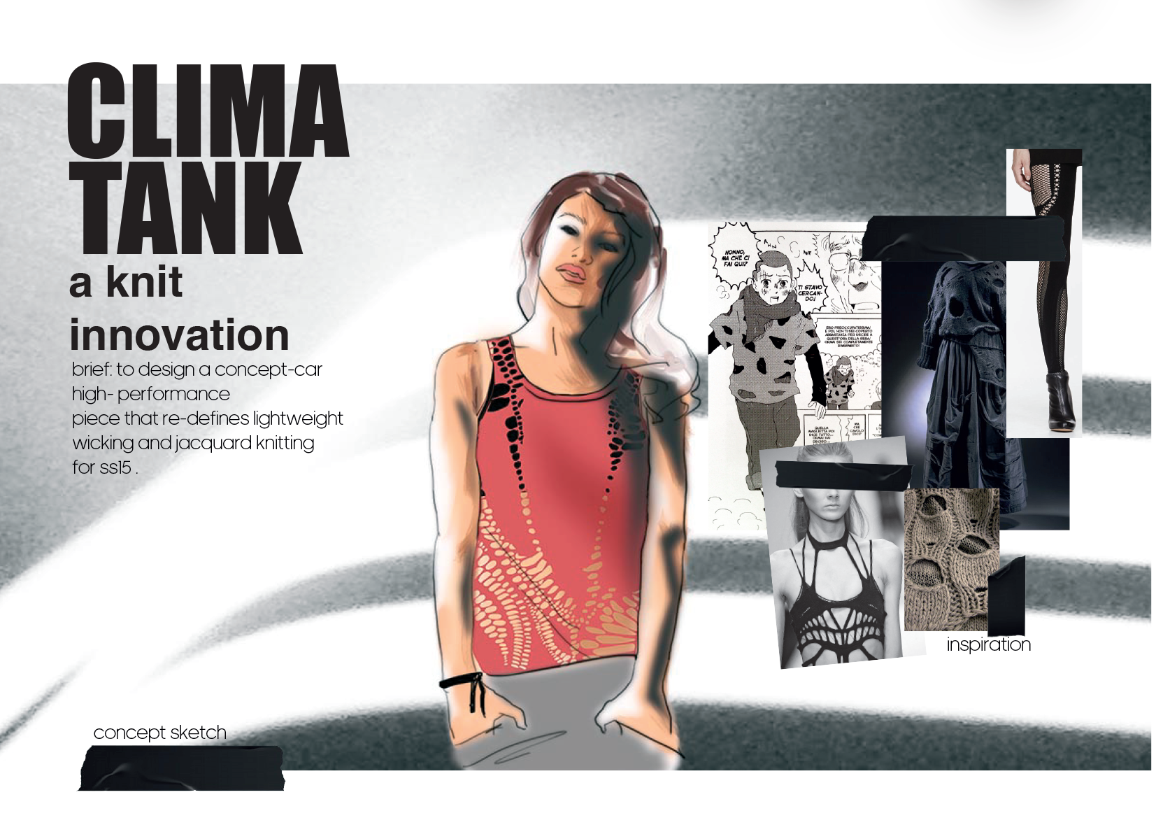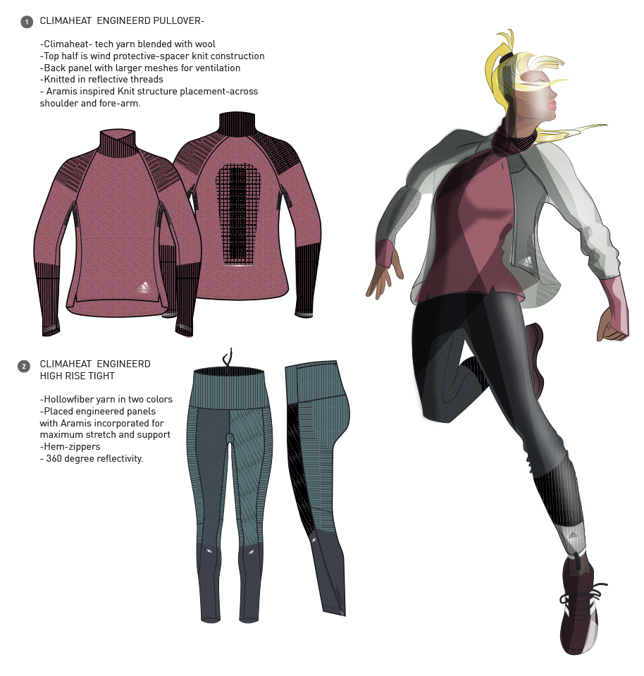 Advanced knitwear created for summer and winter running- using rec pes, wool, lycra , cotton and technical yarns. Technologies used included Flat-knitting,Seamless knitting and Warp-knitting- to create mesh structures, garment shaping ,gathers and stretch . These effects are rare in knitwear.