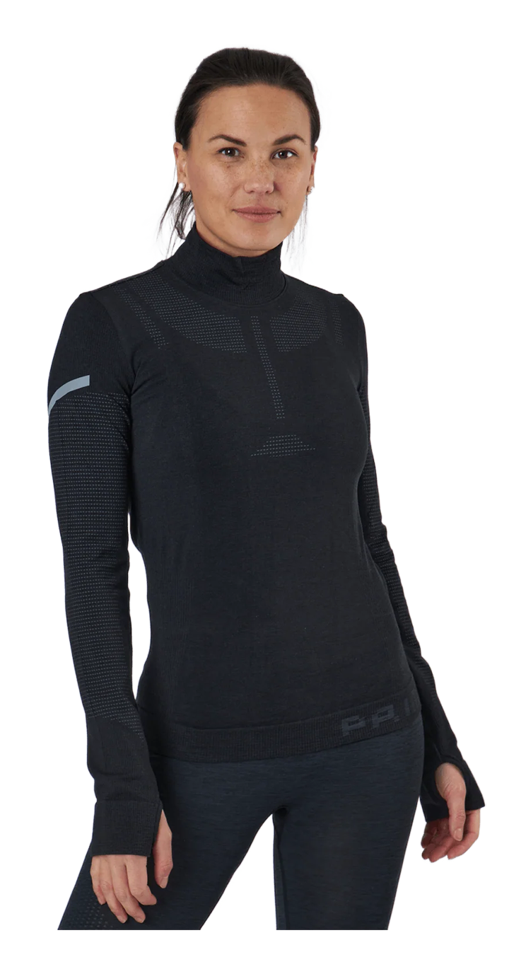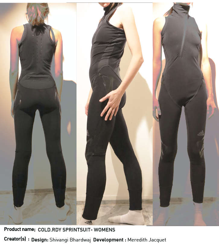 The sprintsuit in Cold.Ready Fleece reduces areas of air exposure keeping all body heat trapped inside.Women athletes like to start out warm- this was the founding premise.The extra zipper allows athletes to take-off top for cooling.The suit is sleeveless to allow user to choose an inner piece for warmth . The sprint-web preint adds compression. Concept sample only.