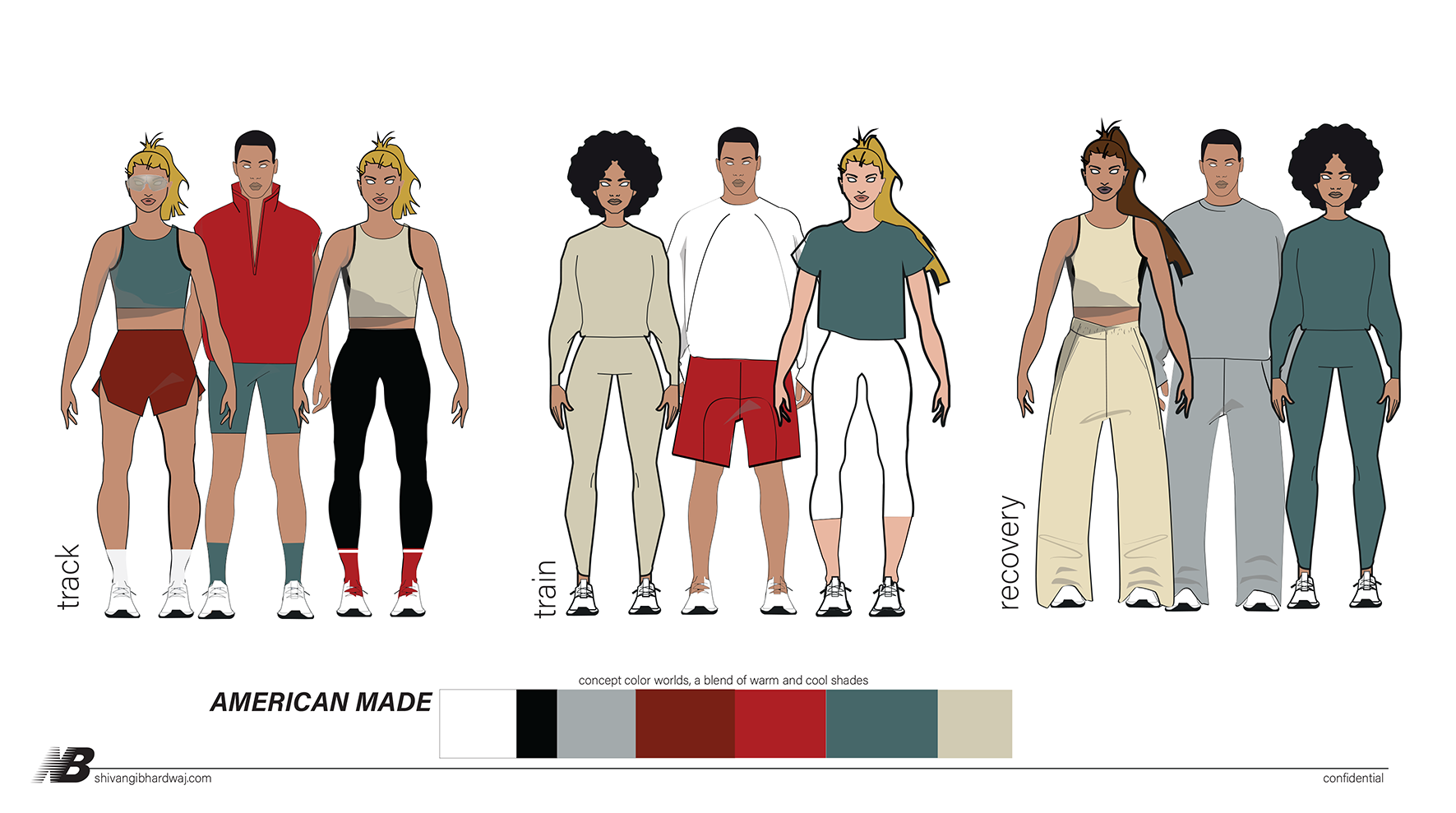 Color concept: Applying the classic red, white and blue through a modern lens. Showcasing how the color palette can function as a key differentiator between categories. Brights in on-court performance , bright pops in indoor training and neutrals in the recovery space.